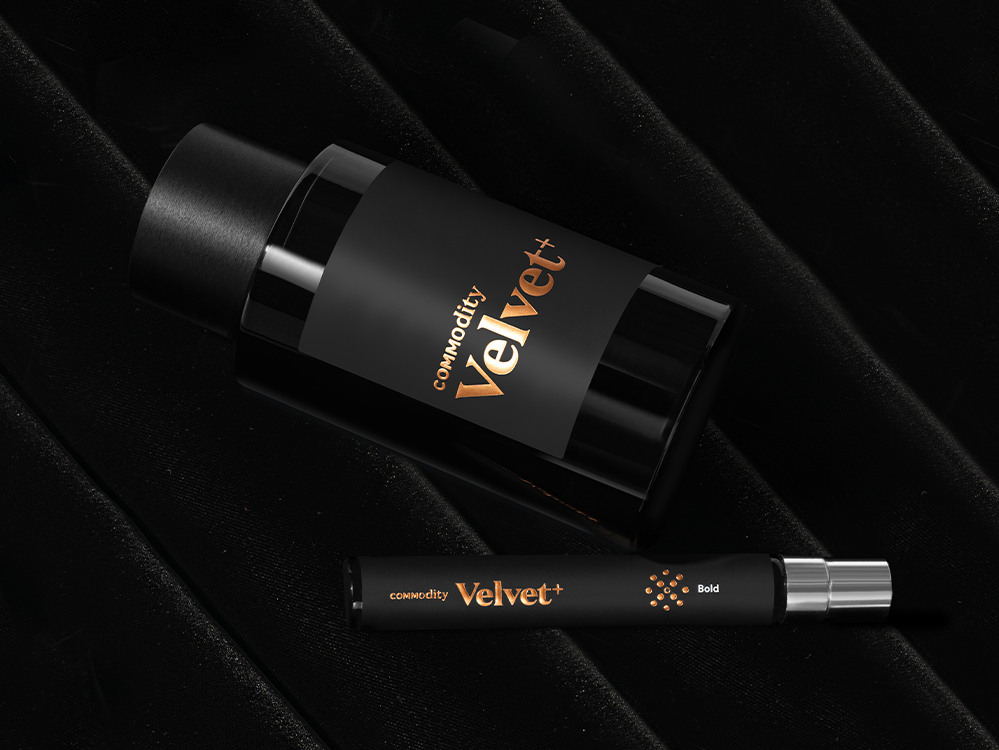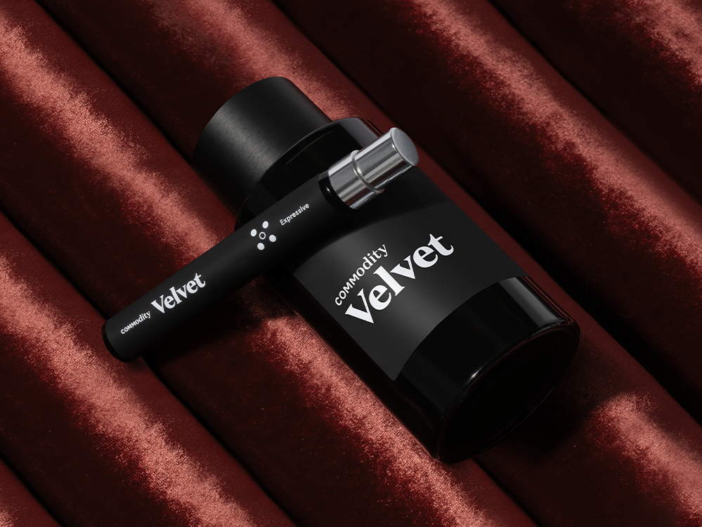"For Commodity Velvet, I was inspired by the image of vibrant pink Turkish Rose Petals floating gently over a mysterious, dark background of richly warm Vanilla and Black Amber with a delicious touch of Roasted Almond drifting in the air. For Velvet+ Bold, Turkish rose is enhanced with exotic Saffron spice and sweet Vanilla. To finish, I merged Labdanum with the warmth and richness of Amber creating an intense, sophisticated and alluring fragrance."—Jerome Epinette